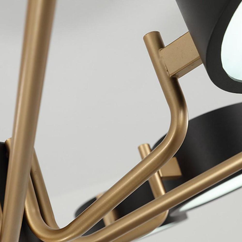 A contemporary chandelier with sleek geometric balance and warm metallic details. From a smooth central hub, eight golden arms extend outward like spokes, each ending in a matte acrylic bowl shade. Integrated LEDs provide adjustable color temperatures from cozy warm white to bright daylight, making it perfect for bedrooms, kids’ rooms, or stylish living spaces.