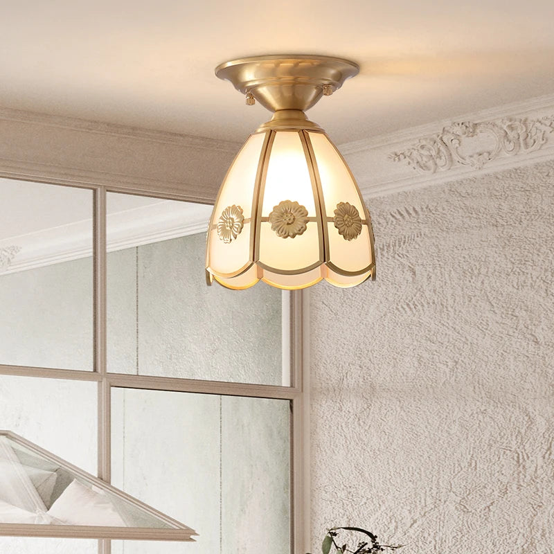 This high-quality ceiling lamp features a Nordic-inspired flower design with a luxurious gold-toned copper and glass construction. Perfect for hallways, balconies, bedrooms, or dining areas, it provides elegant LED illumination and adds a warm decorative touch to modern or vintage interiors.