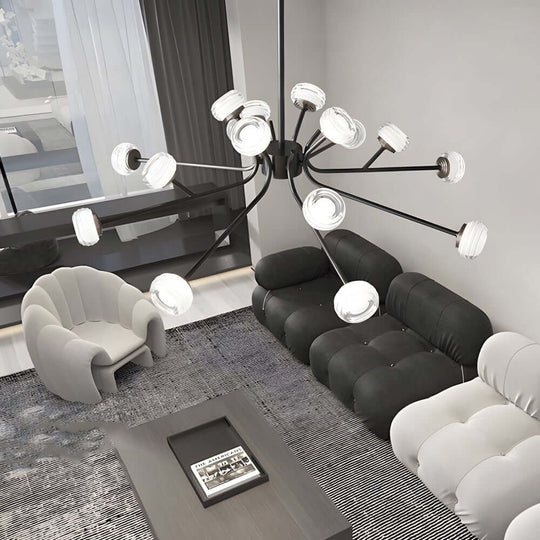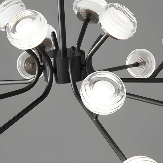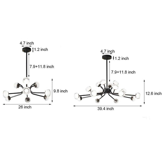 • This modern black LED Sputnik chandelier showcases a bold and elegant silhouette, crafted from durable copper and accented with clear UV acrylic shades. The curved black arms extend gracefully from a central rod, creating a dynamic geometric profile that adds visual impact to any space. Available in 9-light and 16-light configurations, it delivers generous illumination while doubling as a striking decorative centerpiece. The clear acrylic accents refract light beautifully, producing a layered, dazzling glow ideal for both everyday and statement lighting.