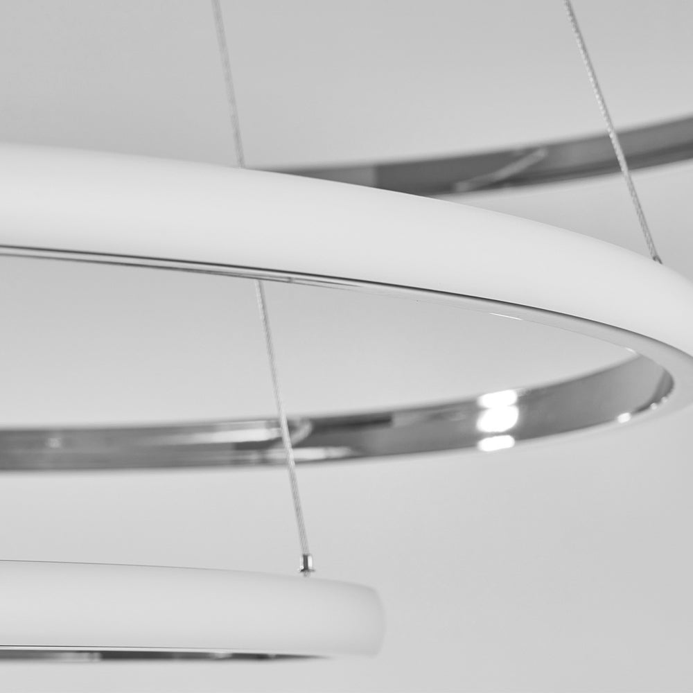 Bring modern sophistication to your home with this striking tiered ring chandelier. Crafted from sleek aluminum with a lustrous chrome finish and luminous silica gel shades, it creates a captivating floating-ring effect. Integrated dimmable LED lighting provides adjustable brightness and color temperature, making it ideal for living rooms, dining areas, and stylish open spaces.