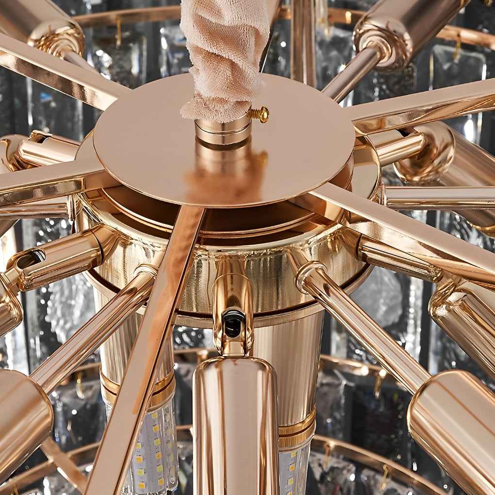 This crystal chandelier elegantly blends postmodern style with classic luxury. Its electroplated hardware frame is delicately inlaid with sparkling crystal strips, creating a refined, light-catching centerpiece. The integrated three-step dimming system provides warm, neutral, or cool white lighting via a standard wall switch, making it ideal for living rooms, bedrooms, or dining spaces.