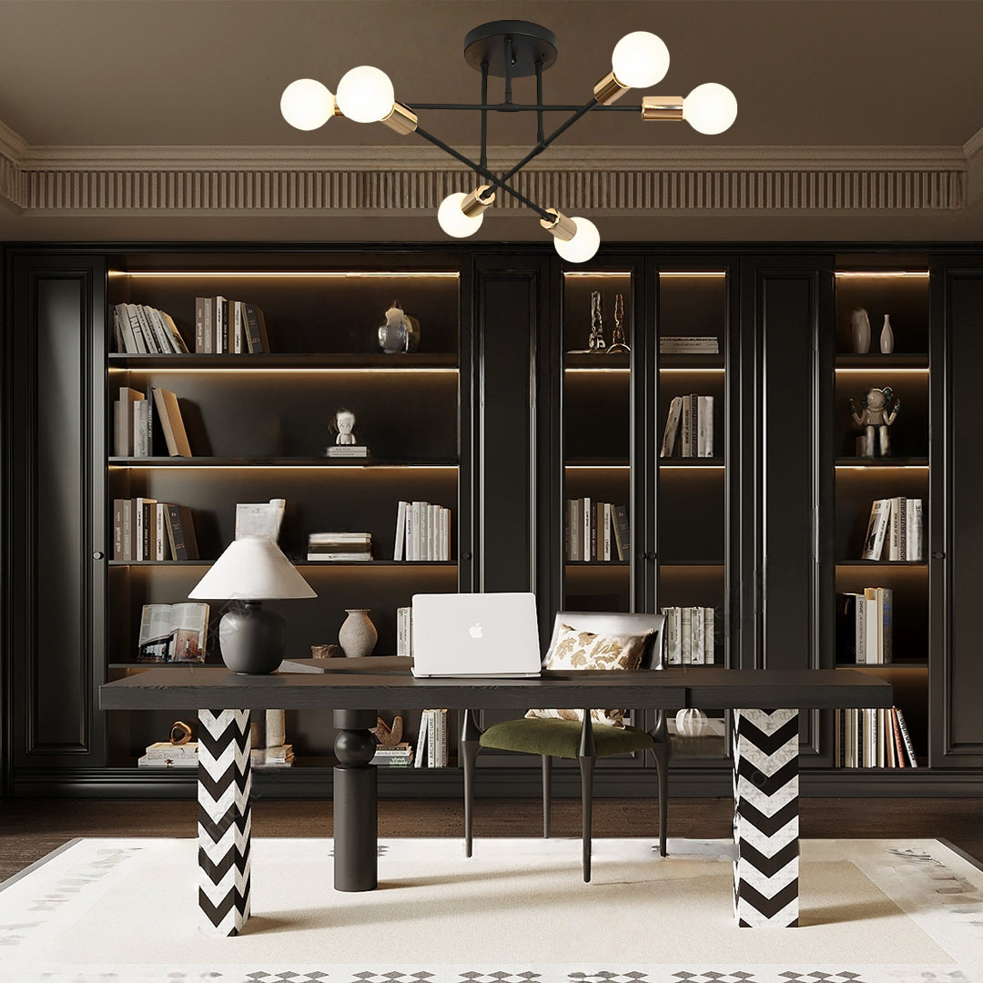 This elegant flush mount ceiling light features a distinctive sputnik design with six linear iron arms radiating from a central hub, creating a striking geometric centerpiece. Available in White and Gold, Black and Gold, or classic single color options, it blends modern style with versatile functionality. Its compact size of 22 inches diameter by 9 inches height makes it perfect for a variety of interior spaces.