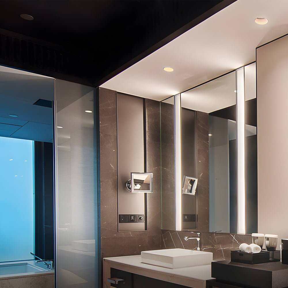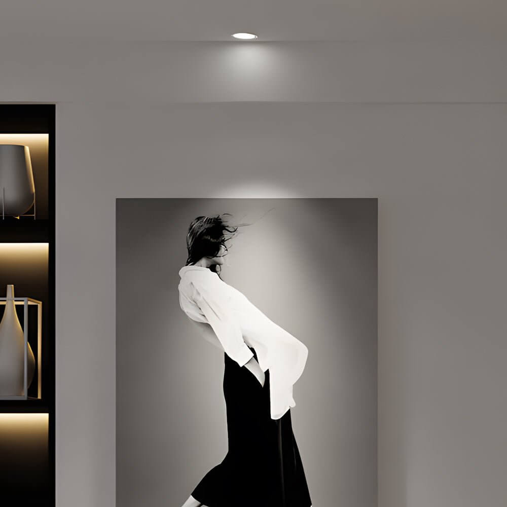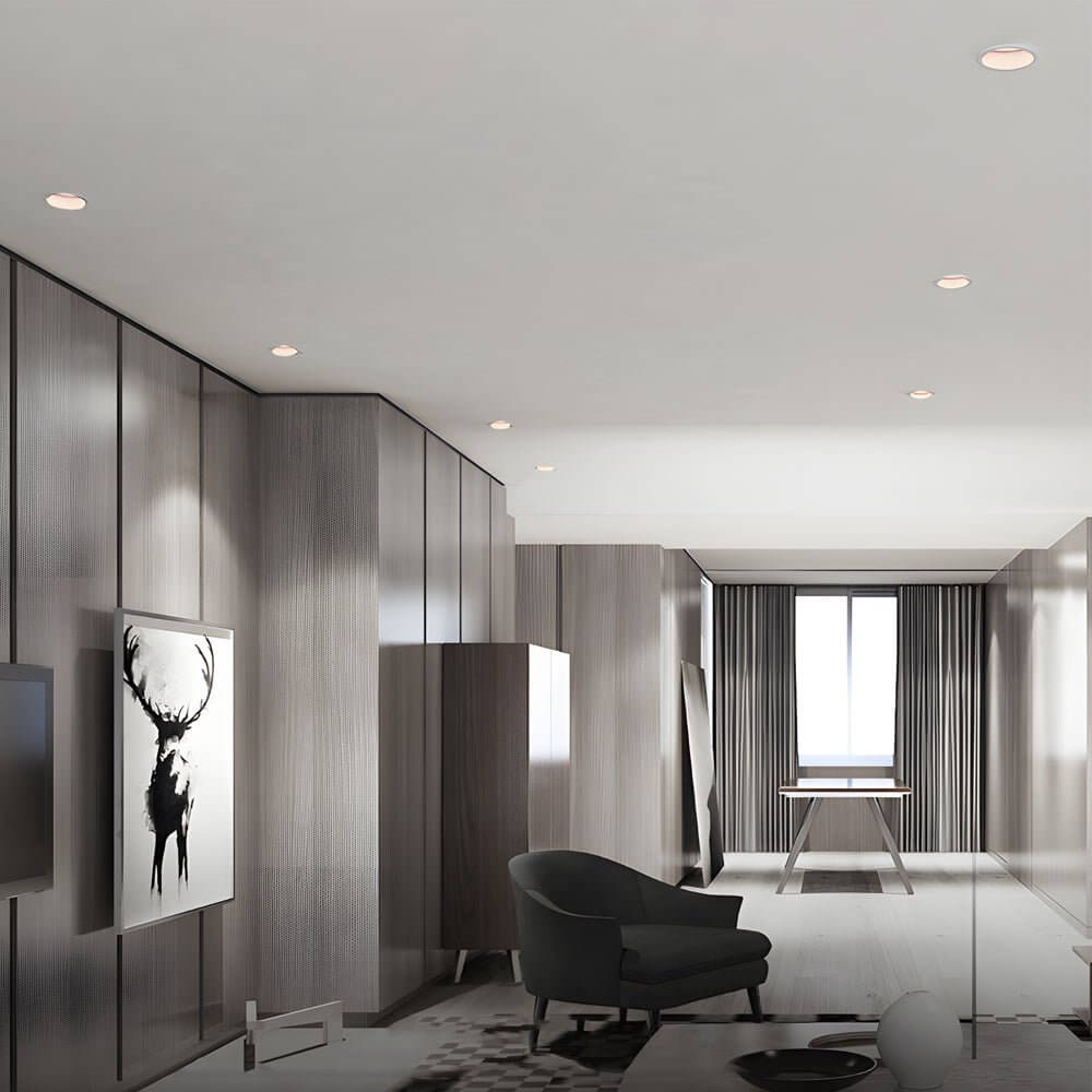 • This 3.3-inch slim trim recessed LED downlight combines energy efficiency with modern design. Crafted from durable aluminum in white or black finishes, it features a deep-set trim that reduces glare while ensuring bright and even illumination. The integrated 10W LED module offers four selectable color temperatures with a high CRI of ≥95, making it suitable for both residential and commercial lighting applications.