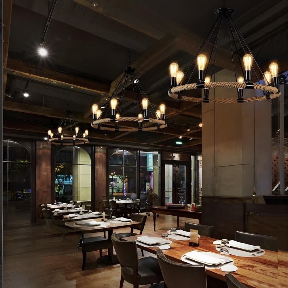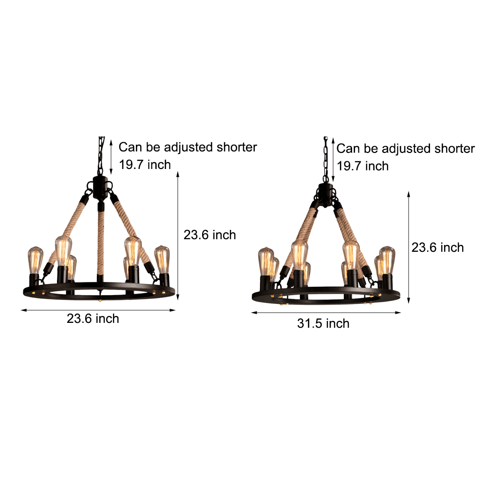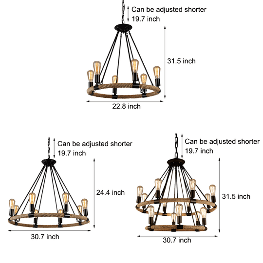 • This rustic industrial chandelier combines vintage charm with durable craftsmanship. Featuring an iron frame wrapped in natural hemp rope, its double-layer design provides depth and a distinctive layered visual effect. Outfitted with E26 Edison LED bulbs, it delivers a warm 3000K glow with full 360-degree illumination. Perfect for bedrooms, living areas, kitchens, and entrances, this chandelier enhances interiors with its farmhouse-inspired aesthetic while ensuring expansive light coverage for larger spaces.