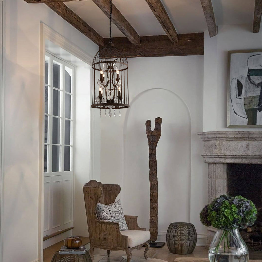A striking chandelier that merges vintage industrial style with refined crystal accents. Designed in the shape of a decorative birdcage, it brings both rustic charm and elegant sparkle to any space. Crafted from durable iron with precision grinding, cutting, and baking paint finishes, it ensures long-lasting performance while offering a warm, inviting glow.