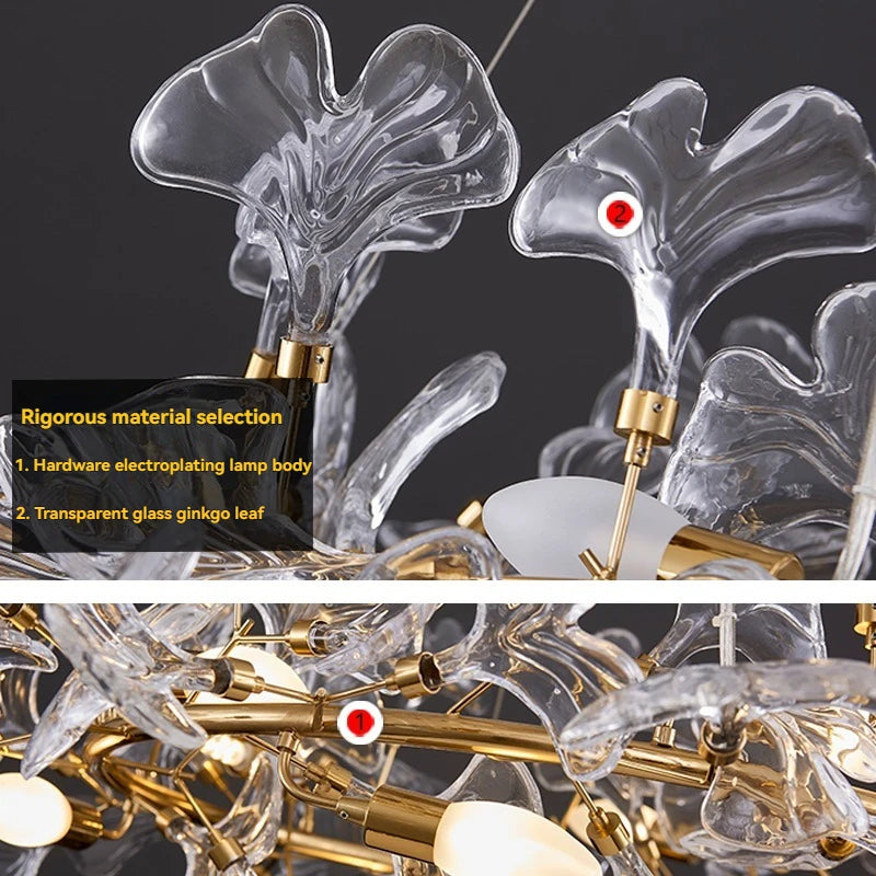 Glass Ginkgo Leaf Chandelier with Gold Branch Frame