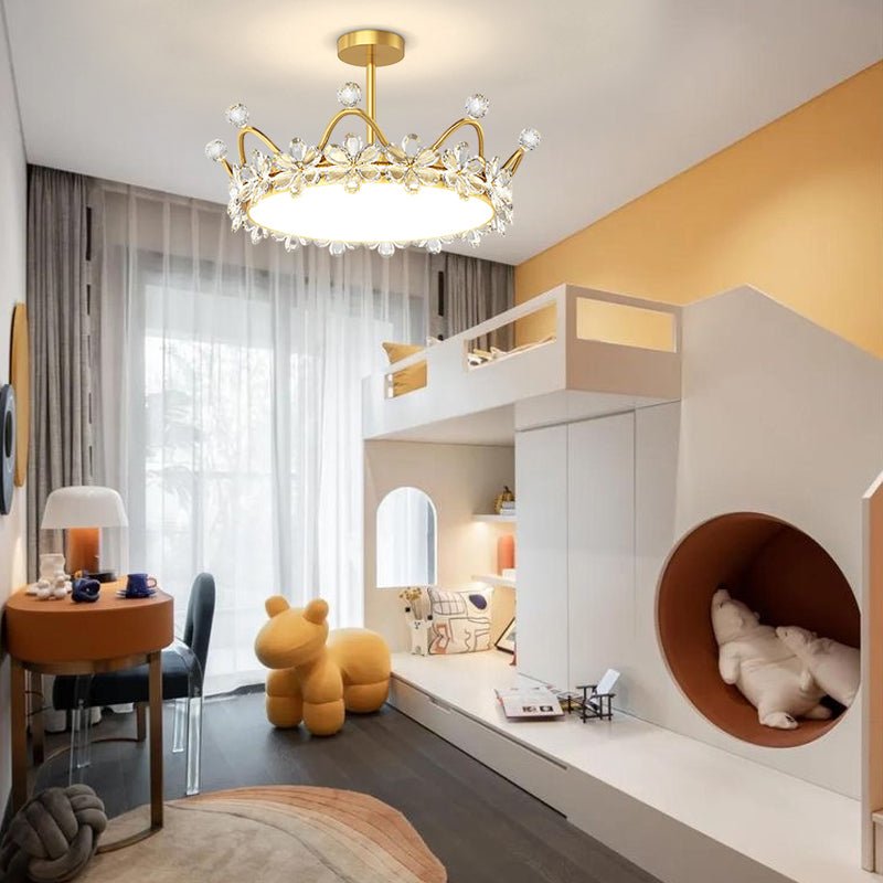 Create a magical, modern ambience with this crystal crown ceiling light featuring optional starry sky projection. Its elegant gold finish, combined with iron, acrylic, and crystal materials, offers a luxurious and contemporary feel. Perfect for bedrooms, children’s rooms, and living areas, this fixture provides soft, adjustable lighting and doubles as a decorative centerpiece.
