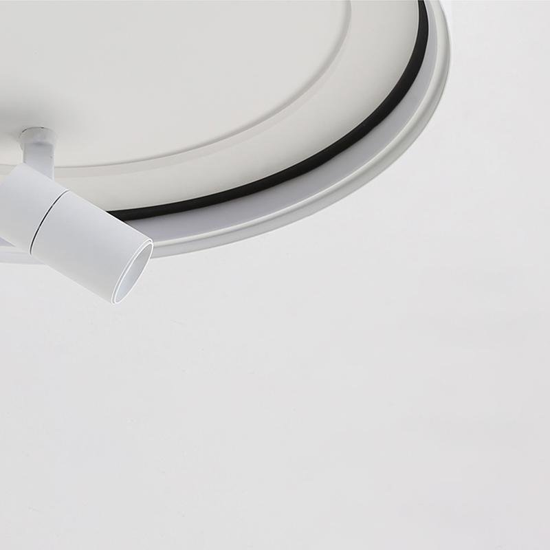 This ceiling light combines flush mount spotlights with a round integrated light to create a striking and functional design. A slim dark line accents the inner frame, adding a refined industrial touch. The spotlights are ideal for highlighting décor or task areas, while the round center provides soft ambient illumination. Remote controlled stepless dimming allows easy adjustment of brightness and color temperature, making it a versatile lighting solution for kitchens, dining rooms, and living spaces.