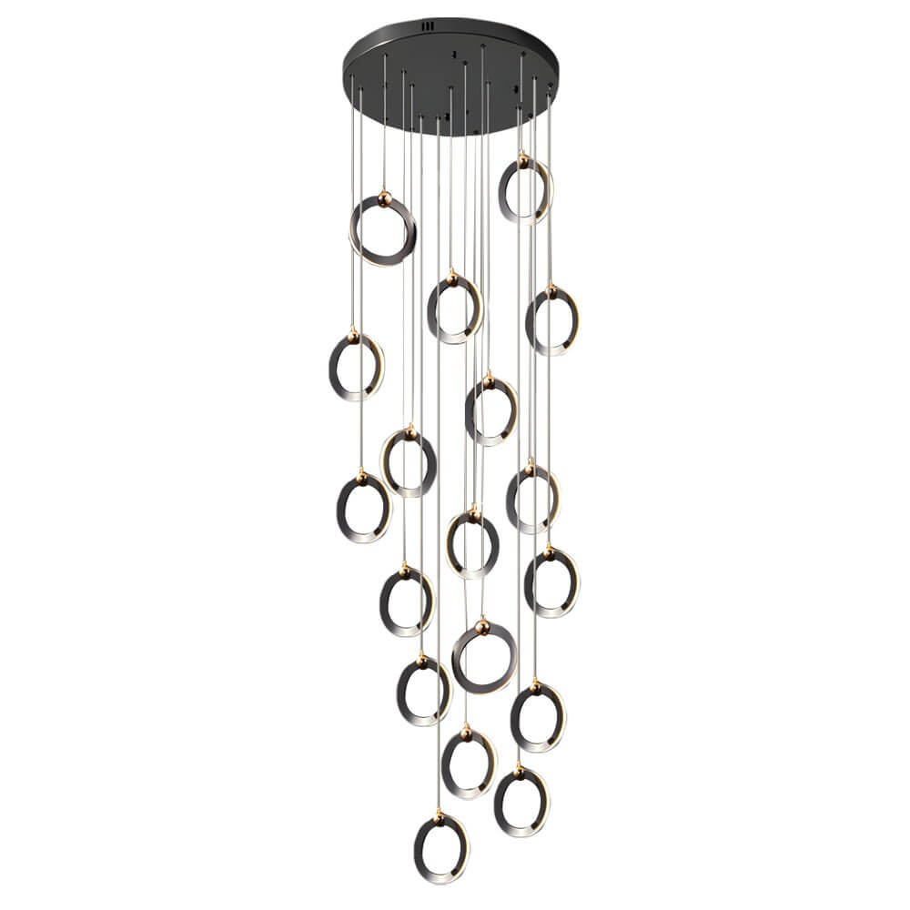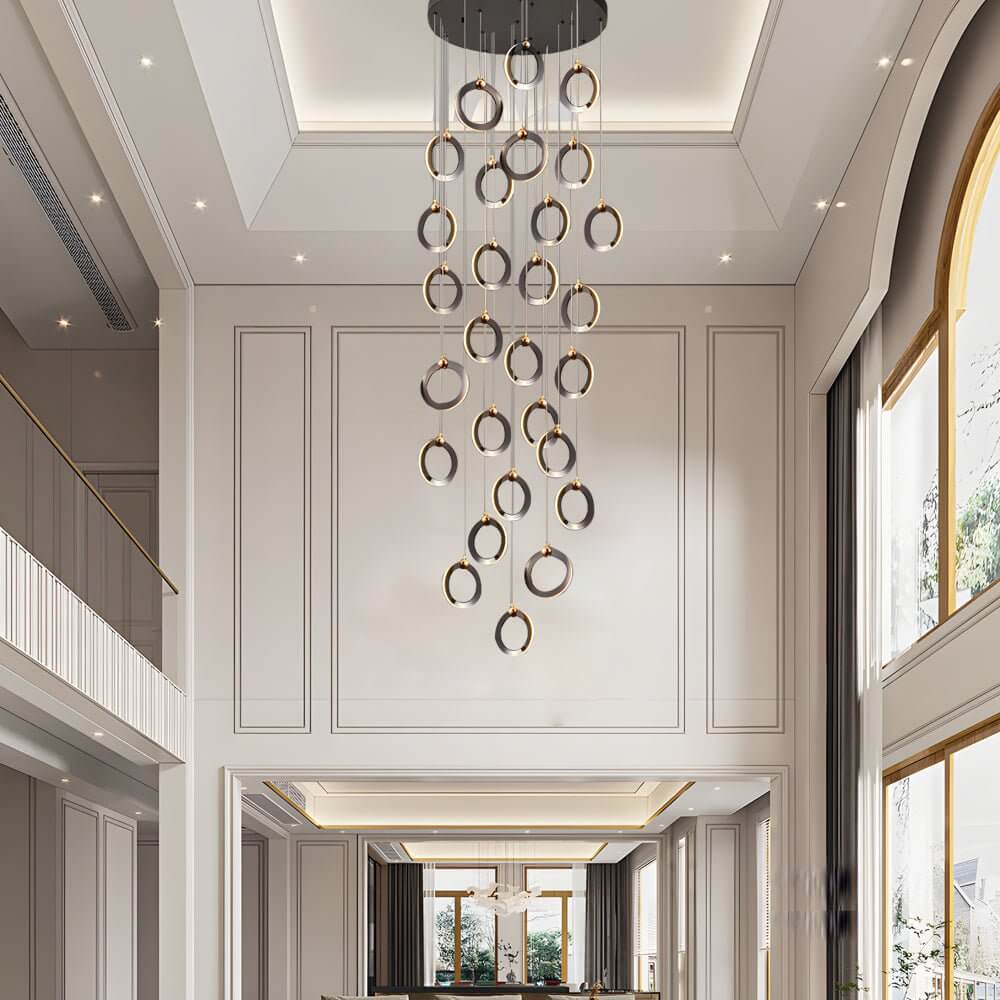 • The LED Ring Clusters Rotating Staircase Chandelier blends modern luxury with futuristic elegance. Designed with multiple acrylic rings suspended from a polished black and gold metal frame, this chandelier delivers a striking visual effect. Hidden integrated LEDs emit a bright yet soft glow, refracted through white acrylic to create a captivating layered illumination. Available in a wide range of sizes from 6 to 28 lights, it is perfect for high ceilings, spiral staircases, villas, foyers, or dining spaces, enhancing interiors with enchanting sophistication.