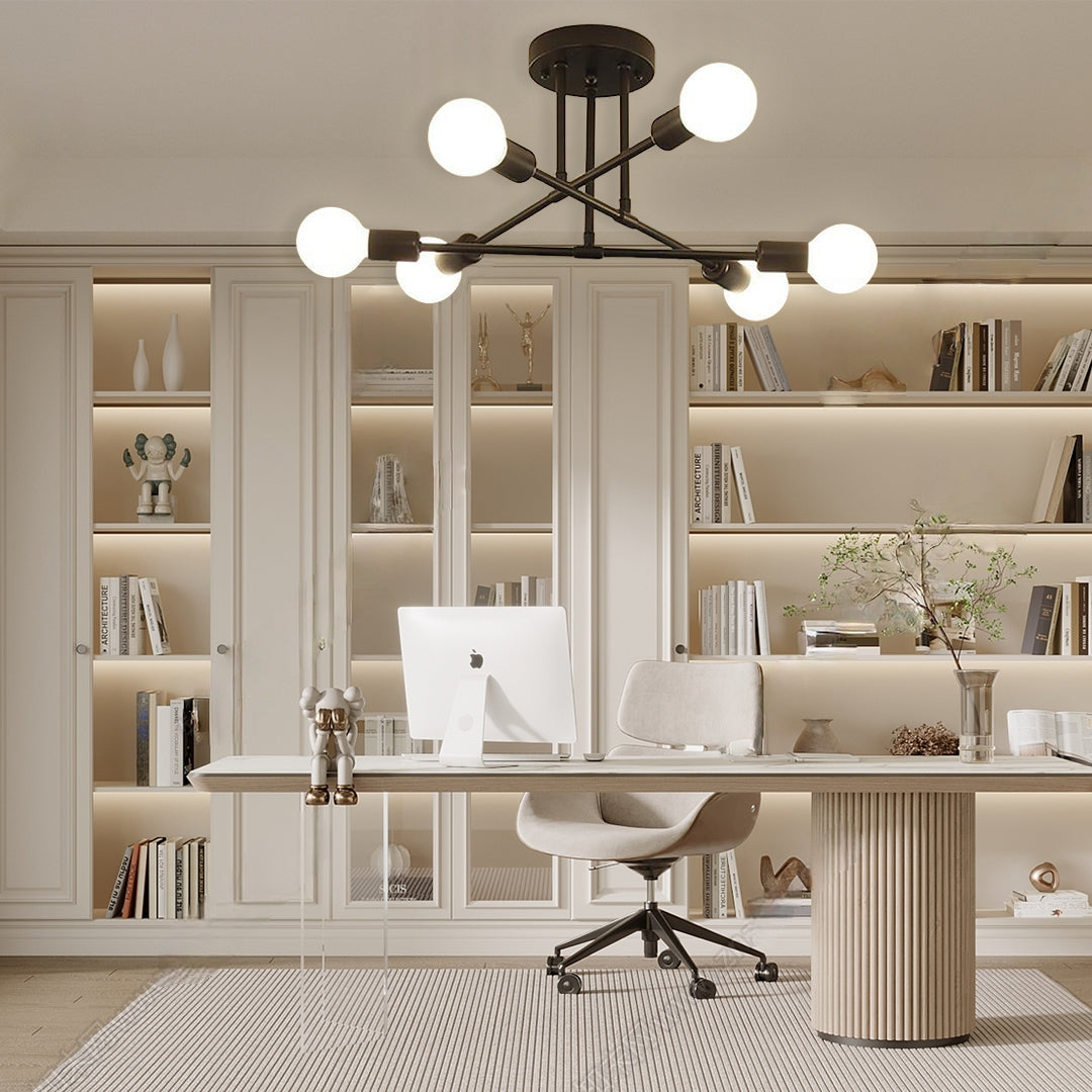 With its striking sputnik-inspired design, this chandelier brings modern elegance to any room. Six crossed iron arms in a choice of gold or black finish support white globe shades, creating a balanced cluster of ambient light. The semi-flush mount silhouette is perfect for spaces needing style and brightness without excessive drop, making it ideal for dining rooms, living areas, bedrooms, and more.