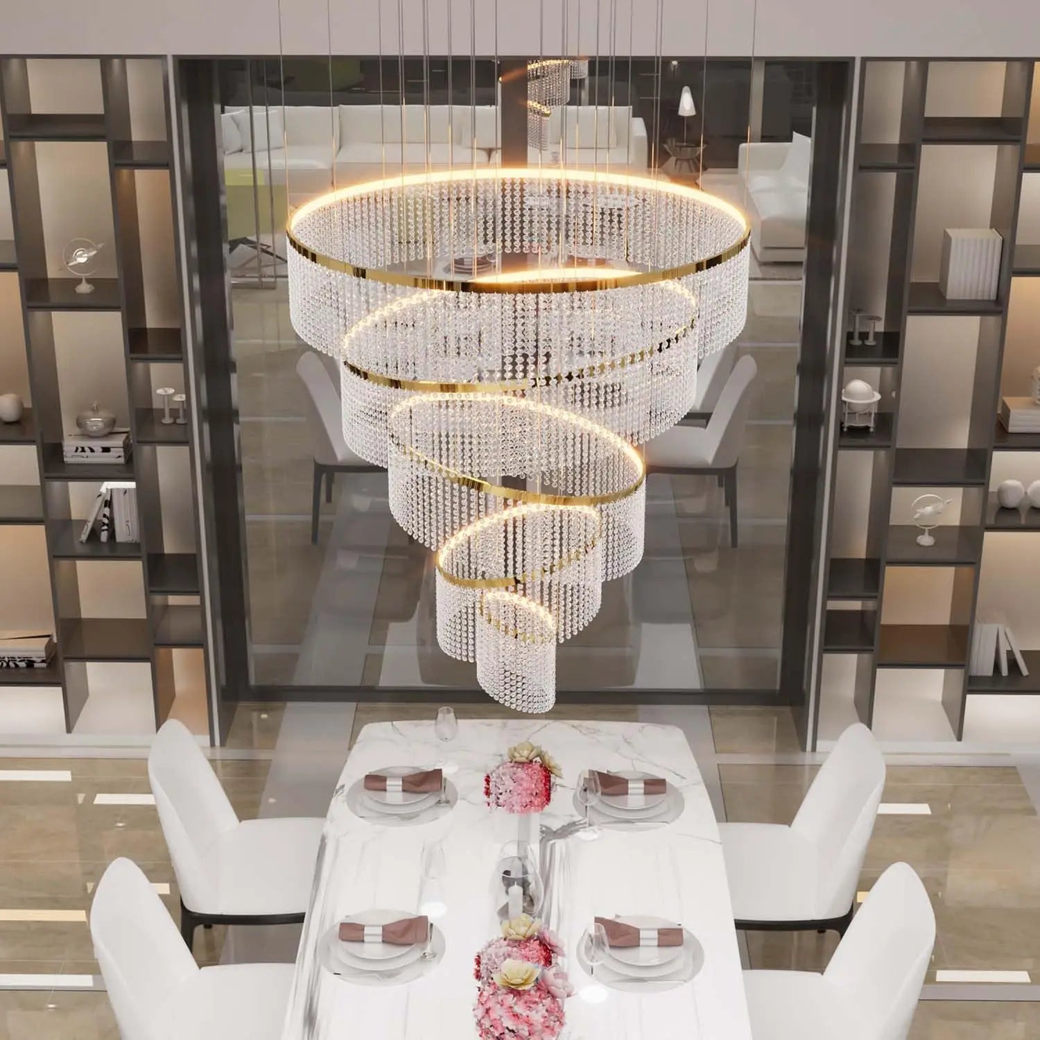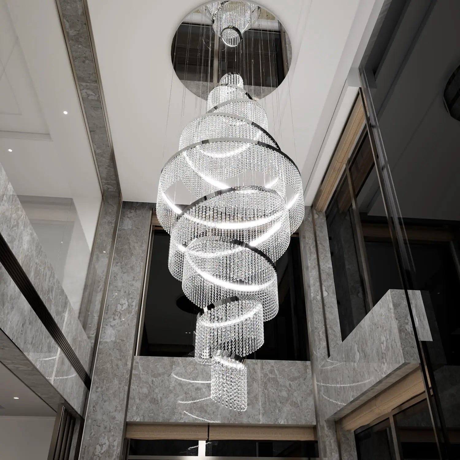 This grand crystal ring chandelier creates a dramatic cascade of shimmering K9 crystals, perfect for staircases, villas, and double-height foyers. Its round raindrop-inspired design reflects light beautifully, adding modern elegance to luxury interiors.